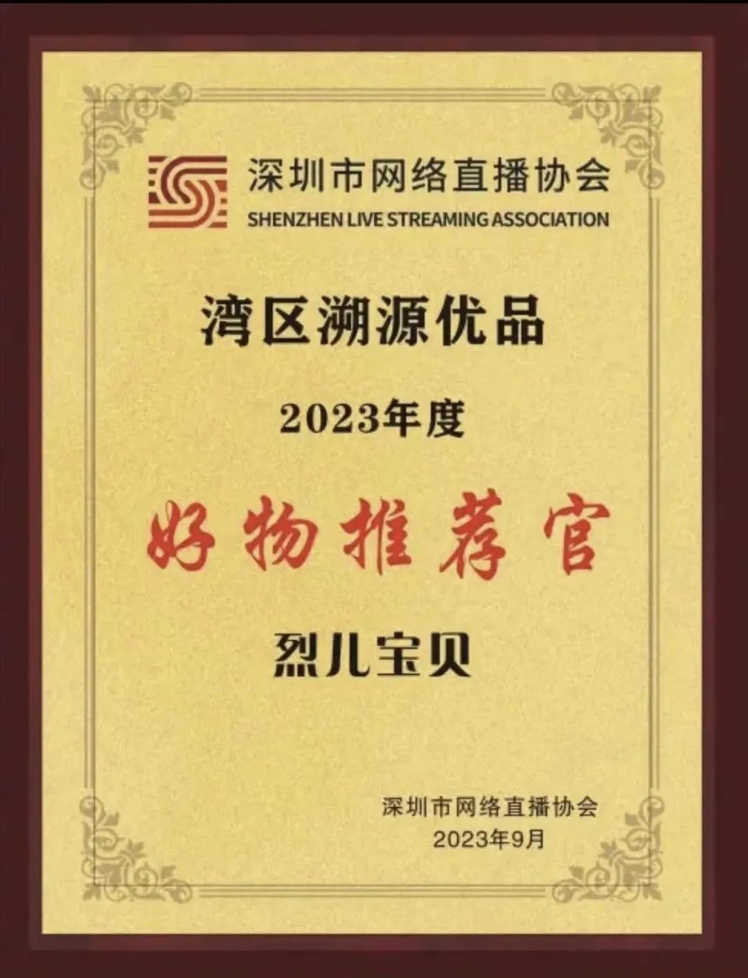 直播当天,深圳市网络直播协会副会长谢穗嘉授予烈儿宝贝“湾区溯源优品2023年度好物推荐官”荣誉称号!谢会长表示,松岗琥珀文化产业园是全球规模最大的琥珀交易市场,自松岗珠宝抖音电商直播基地成立以来,带动上下游珠宝商家大力发展直播电商、内容电商,并取得良好成效。此次湾区溯源优品直播电商专场活动是产业带直播的典型模式,由产业带提供源头货品、平台提供流量及主播团队、政府和协会给予背书支持,最终实现中小商家受益的局面。松岗琥珀作为产业带源头电商直播的示范窗口,将推动湾区产业带的数字化营销日益成熟,助力湾区经济发展更上一层楼!