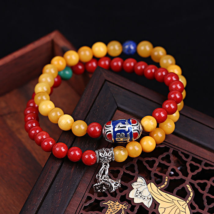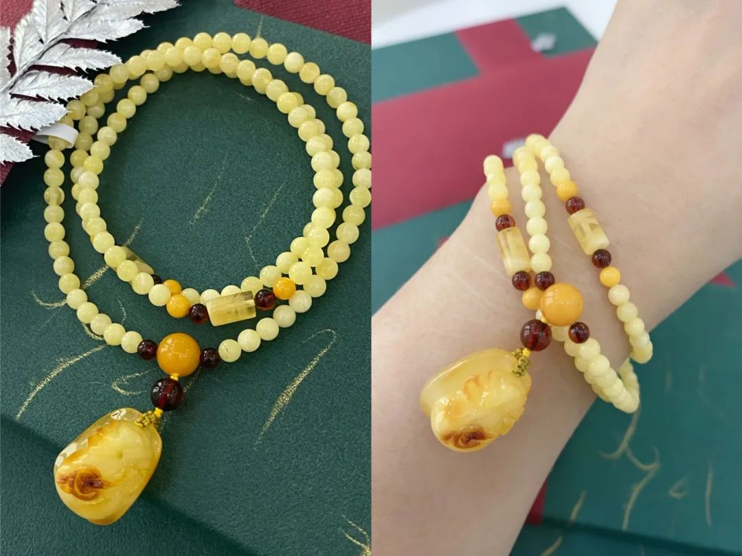 如蜜蜡手串,浅黄色的蜜蜡为主体材质,那我们就可以选择同色系的金珀或者老蜜蜡色、椰壳等作为隔珠来点缀搭配,不仅和谐也能增加手串整体的层次感。